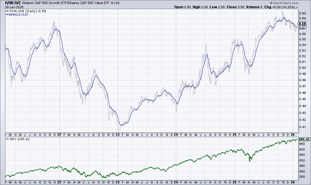 Five-year chart of the IVW-IVE ETF Ratio (Growth-Value) over the S&P 500 (SPY ETF) (Source: StockCharts.com)
